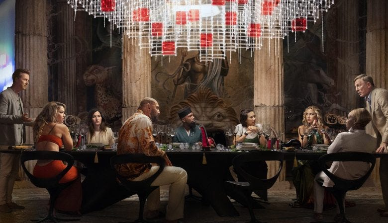 This is the only kind of pandemic movie I want: one where the pandemic is acknowledged and used as a way to enhance character development (the type of mask each character wears is very clever), and then, largely ignored for the rest of the movie. The quirky group of would-be detectives is trapped on an isolated island, and as Mike White has taught us, islands are the perfect setting for messy rich people nonsense.